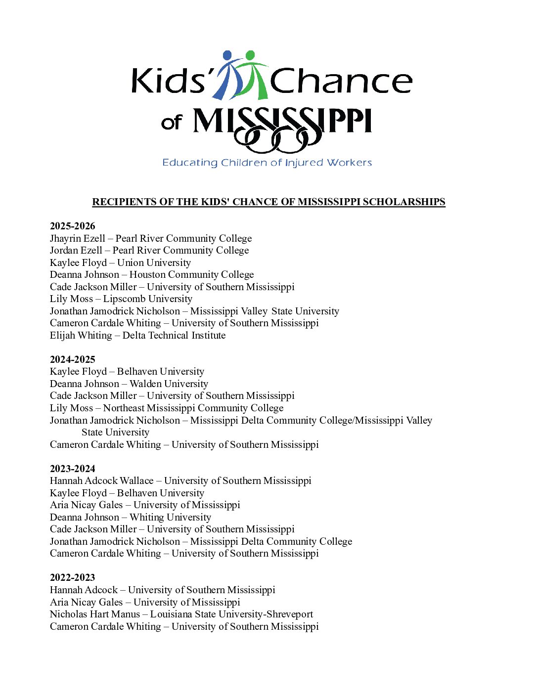 The Scholarship Committee of Kids’ Chance of Mississippi reviews all applications and recommends recipients to the Board of Directors. The committee is made up of representatives from the legal community, the medical profession, insurance companies, and insured employers.